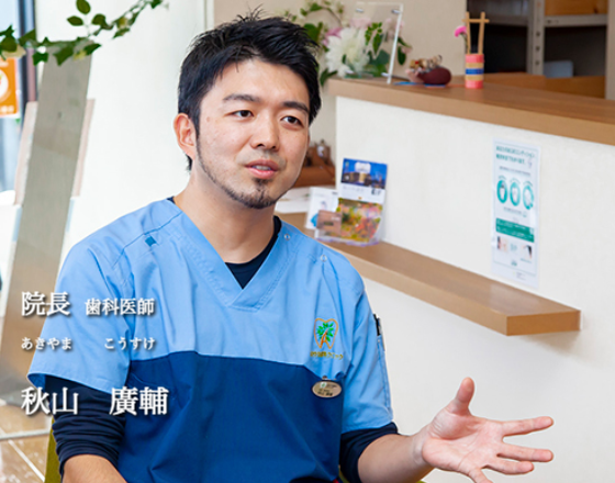皆様、初めまして。 あきやま歯科クリニック院長の秋山廣輔(あきやま こうすけ)と申します。 2017年4月に、私の故郷である明石市魚住町で歯科医院を開院させていただきました。 私が開院する医院のすぐ隣には、秋山小児矯正歯科医院があり、約30年間、両親が日々診療に励んでおります。 幼い頃からわんぱくだった自分を育ててくれた土地、そして一人の人間としての土台を築いてくれた土地で、歯科医師として地域の皆様の口腔健康の維持・増進に貢献できることをとても幸せに感じます。 歯科医療は、「笑う」「話す」「食べる」という、生活の中の「当たり前」を支える医療と考えます。 この「当たり前」があるからこその「安心した生活」を生涯を通して感じて頂ける歯科医療をお届けします。 「安心した生活」を送るために、皆様との対話を大切にして「安心して通院できる歯科医院」を目指していきますので、どうぞ宜しくお願い申し上げます。
